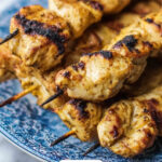 Thread the marinated chicken pieces evenly onto the soaked skewers, making sure not to overcrowd them. Preheat your grill or griddle over medium-high heat and brush the grates with olive oil to keep things from sticking. Grill the chicken skewers for about 5 minutes total, turning frequently to achieve an even, golden-brown char. Use an instant-read thermometer to check for an internal temperature of 160°F — it will continue to rise to a safe 165°F as it rests. Brush the chicken lightly with reserved marinade while grilling, but discard any leftover marinade after cooking for food safety.