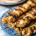 - Grill Chicken: Place chicken skewers on the grill or griddle and cook for about 5 minutes total, turning frequently to brown all sides evenly. The internal temperature should reach 160°F; it will continue to 165°F while resting. Lightly brush the chicken with reserved marinade during grilling, discarding any leftover marinade afterwards.