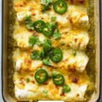 Spread ¾ cup of green enchilada sauce evenly on the bottom of your casserole dish. Set the rolled enchiladas snugly in a row on top, then pour the remaining 1 cup of sauce over, finishing with the last ¾ cup of cheese sprinkled on top. Pop it in the oven for 25 to 30 minutes until everything is hot and bubbly.