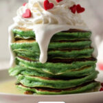 Stack your green pancakes, drizzle generously with the cream cheese glaze, and sprinkle on red heart sprinkles for that extra festive feel. Add a dollop of whipped cream and fresh fruit if you like — it’s the perfect combination of colors and flavors.