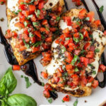 This Easy Bruschetta Chicken recipe features tender, seasoned chicken breasts grilled to perfection, topped with a fresh and vibrant tomato basil topping and a slice of melted mozzarella cheese. Finished with a drizzle of balsamic glaze, this dish combines classic bruschetta flavors with juicy grilled chicken for a delicious and simple main course.