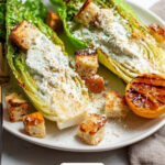 Lay the grilled romaine hearts out on a serving platter. Sprinkle generously with grated Parmesan, scatter your homemade croutons on top, and drizzle the smoky Caesar dressing over everything. Serve right away with those gorgeous grilled lemon halves on the side—encourage everyone to give their salads a squeeze of that smoky, caramelized citrus for a lively burst of flavor.