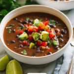 A hearty and flavorful Black Bean Soup featuring a blend of black beans, smoky bacon, fresh vegetables, and spices, simmered to perfection and served with optional delicious toppings.