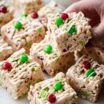 Celebrate the holidays with these festive and chewy Holiday Rice Krispie Treats loaded with mini marshmallows, colorful M&M's, and sprinkles, all drizzled with creamy white chocolate. These treats are easy to make and perfect for sharing during the holiday season.