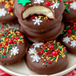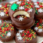 Use a fork or dipping tool to coat each mint patty completely in the melted chocolate, letting excess drip off before placing it back on the lined sheet. While the chocolate is still wet, sprinkle your festive Christmas sprinkles on top. Let them set completely at room temperature or pop them briefly in the fridge if you’re impatient like me!