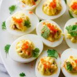 - Garnish and Serve: Sprinkle the tops with finely grated carrots and thinly sliced green onions. Serve the deviled eggs immediately or store them in an airtight container in the refrigerator until ready to serve.