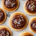 - Finish Cookies: Spoon melted chocolate over the caramel layer, then immediately sprinkle with flaky sea salt and edible gold leaf if using. Let the cookies cool until the caramel and chocolate set completely before serving.