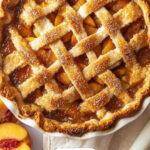 This easy peach pie features a gooey, fresh peach filling encased in a perfectly flaky, buttery crust. Topped with a lattice crust and a sprinkling of coarse sugar, this classic dessert is irresistible when served warm with a scoop of vanilla ice cream.
