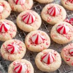 - Add the candy kiss: Remove the cookies from the oven and cool for 5 minutes. Then gently press an unwrapped Hershey’s Candy Cane Kiss into the center of each cookie.