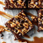 - Frost Brownies and Garnish: Once the caramel has set, spread the chocolate frosting evenly over the brownies. Sprinkle with remaining ½ cup chopped pecans, ¼ cup mini chocolate chips, and drizzle with the remaining ¼ cup caramel sauce.