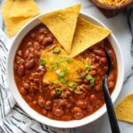 - Finish and serve: Taste the chili and adjust salt as needed. Serve hot topped with your favorite garnishes such as sour cream, shredded cheese, green onions, or corn chips.