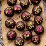 - Decorate and Set: Before the coating sets, sprinkle with cacao nibs, chopped pistachios, or freeze dried raspberries. Allow to set fully at room temperature or in the fridge.