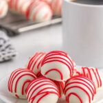 - Drizzle Garnish: Lightly drizzle the melted red candy melts over the coated cheesecake bites in stripes using a fork, spoon, or squeeze bottle.