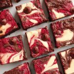 Decadent red velvet chocolate cheesecake brownies featuring layers of rich brownie batter and creamy vanilla and chocolate cheesecake fillings. These brownies combine the nutty flavor of browned butter with smooth ganache and a vibrant red velvet twist, baked to perfection and swirled for a stunning finish.