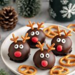 Delicious and festive Reindeer Oreo Balls made with crushed Oreos, cream cheese, and coated in rich dark chocolate, decorated with pretzel antlers, candy eyes, and a colorful nose for a perfect holiday treat.