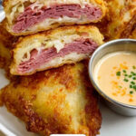 Delight in these crispy, flavorful Reuben Egg Rolls filled with tangy sauerkraut, savory corned beef, and melty Swiss cheese. Perfectly golden and served with classic Thousand Island dressing, these egg rolls offer a fun and delicious twist on the traditional Reuben sandwich in a handheld form.
