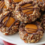 These Salted Caramel Turtle Thumbprint Cookies combine a rich chocolate dough coated in crunchy pecans with a luscious salted caramel center and a drizzle of melted chocolate, creating a decadent treat perfect for dessert or special occasions.