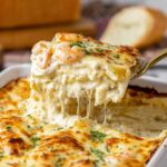 This creamy seafood lasagna combines succulent shrimp and lump crab meat layered with rich béchamel sauce infused with clam juice, mozzarella, and parmesan cheese. Baked to golden perfection, it's a delightful twist on traditional lasagna that's perfect for seafood lovers looking for an impressive, comforting main course.