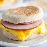 - Assemble Sandwiches: To serve, place one egg square on a toasted English muffin half along with your choice of bacon, Canadian bacon, or ham. Top with the other muffin half and enjoy your breakfast sandwich!