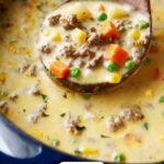Return the cooked ground beef and toss in your frozen mixed vegetables. Let everything heat through for about five minutes. Then, remove from heat and gently stir in shredded cheddar, bit by bit, to get that luscious, melty cheese swirl. Just make sure your soup isn't boiling at this point, or the cheese won’t melt smoothly.