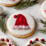 - Create Santa Hat Cookies: Let remaining cookies set on baking sheet. Melt white chocolate and fill a pastry bag with a small portion. Mix remaining chocolate with red oil-based food coloring until desired red color is reached; put in a piping bag. Swirl the red chocolate in the shape of a hat on cookies, add white chocolate to rims and tops, then sprinkle with sanding sugar. Optionally, use green food coloring for Christmas tree designs.