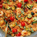 This Shrimp and Rice Skillet is a flavorful one-pan meal combining sautéed zucchini, garlic, and Italian seasonings with tender shrimp and fluffy white rice cooked in savory chicken broth. Topped with fresh basil and cherry tomatoes, it's an easy and satisfying dinner perfect for weeknights.