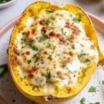 This Skinny Chicken Alfredo Stuffed Spaghetti Squash is a healthier take on classic creamy Alfredo. Tender roasted spaghetti squash strands are mixed with a light, lemony chicken Alfredo sauce made with reduced-fat milk and Parmesan, then topped with mozzarella and baked to golden perfection. This comforting dish is perfect for a low-carb, protein-packed dinner.