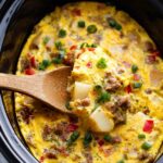 - Pour egg mixture over: Carefully pour the prepared egg mixture evenly over the meat and vegetable layer in the slow cooker, gently pressing down to distribute.