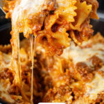 - Add pasta and sauce layers: Sprinkle half of the uncooked bowtie pasta evenly over the sauce. Pour the remaining half jar of marinara sauce over the pasta layer.