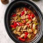 This Slow Cooker Salt & Pepper Sticky Chicken is a flavorful and easy-to-make dish featuring tender chicken breast cooked in a savory blend of ginger, soy sauce, Chinese five spice, and a touch of sweetness from brown sugar. Finished with fresh red peppers and spring onions, it's perfect served over rice or noodles for a comforting meal.