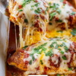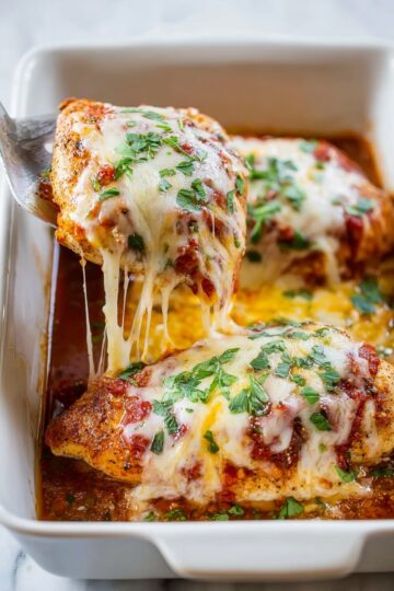 Bake the chicken uncovered for 35 minutes. To be sure it’s perfectly cooked, use a meat thermometer to check that the internal temperature reaches 165 degrees Fahrenheit. Once done, sprinkle the shredded cheese evenly over each breast. Switch your oven to broil on high, place the dish under the broiler, and watch carefully as the cheese melts and becomes golden—this usually takes just 1 to 2 minutes. That bubbly, cheesy topping is the best part!