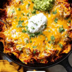 Remove the skillet from the oven and sprinkle a handful of fresh chopped cilantro over the top for a burst of herbal brightness. Serve immediately with dollops of sour cream and guacamole on the side. The creamy, cool toppings perfectly balance the spicy, cheesy skillet and make for a comforting, crowd-pleasing dinner.
