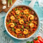 A classic and hearty Cajun jambalaya featuring smoky andouille sausage, tender chicken, fresh vegetables, and succulent shrimp simmered with aromatic spices and rice in a flavorful tomato broth. Perfect for a comforting dinner that captures the essence of Southern cooking.