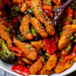 Return the chicken to the pan with the vegetables. Pour the sauce evenly over the top and stir frequently to coat everything in that luscious sauce. Let it cook for a few minutes until the sauce thickens and the chicken is fully cooked through — that’s usually about 2-3 minutes. You’ll know it’s ready when the sauce glistens and clings to each tender strip and veggie.