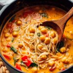 This vibrant Thai Red Curry Soup is a flavorful, comforting dish featuring tender vegetables, creamy coconut milk, and fragrant red curry paste. Packed with protein-rich chickpeas and tender rice noodles, it offers a satisfying and aromatic meal perfect for any day.