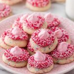 Strawberry Kiss Cookies are delightful sugar cookies with a soft, creamy texture thanks to cream cheese, coated in pink or white sanding sugar or non-pareils, and topped with a signature Hershey’s Strawberry Ice Cream Cone Kiss. These festive, eye-catching cookies are perfect for celebrations or a sweet treat anytime.