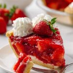 A delightful strawberry pie featuring a buttery crust filled with a homemade strawberry filling thickened with cornstarch and gelatin, chilled to perfection and topped with whipped chantilly cream.