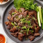 Korean Beef Bulgogi is a super easy Korean BBQ recipe featuring thin, tender slices of marinated rib eye steak cooked quickly with a flavorful blend of pear, soy sauce, and gochujang. Perfect for a delicious and authentic Korean dinner in under 3 hours.
