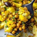This vibrant Turmeric Cauliflower and Chickpea healthy sheet pan dinner is a flavorful and nutritious meal featuring roasted cauliflower, potatoes, chickpeas, and olives tossed in a zesty turmeric and lemon marinade. It’s easy to prepare, packed with Mediterranean-inspired flavors, and served with quinoa and a dollop of Greek yogurt for a perfect balance of creamy and bright tastes.