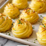 A classic recipe for creamy, buttery Duchess Potatoes made with Yukon gold potatoes, garlic, Parmesan cheese, and a hint of nutmeg, piped into elegant swirled mounds and baked to golden perfection. Perfect as a comforting side dish for any meal.