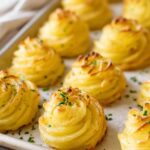 A classic recipe for creamy, buttery Duchess Potatoes made with Yukon gold potatoes, garlic, Parmesan cheese, and a hint of nutmeg, piped into elegant swirled mounds and baked to golden perfection. Perfect as a comforting side dish for any meal.