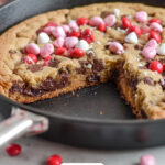 Store any leftover Valentine’s Day Chocolate Skillet Cookie covered at room temperature for up to 3 days to keep it soft and chewy. For longer storage, refrigerate the cookie in an airtight container for up to a week.
