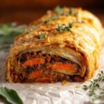This Mushroom Wellington recipe is a delicious vegetarian main course featuring a savory mushroom and caramelized onion filling layered with sweet potatoes and wrapped in flaky puff pastry. Perfectly baked to golden brown, it makes an impressive and hearty meal for any occasion.
