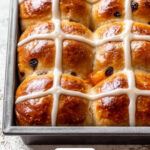 Delicious traditional British Hot Cross Buns featuring a soft, spiced dough studded with dried fruit, glazed with apricot jam, and topped with a sweet, pipeable icing cross. Perfect for Easter or any special occasion, these buns are made with warming spices and a hint of orange zest for extra flavor.
